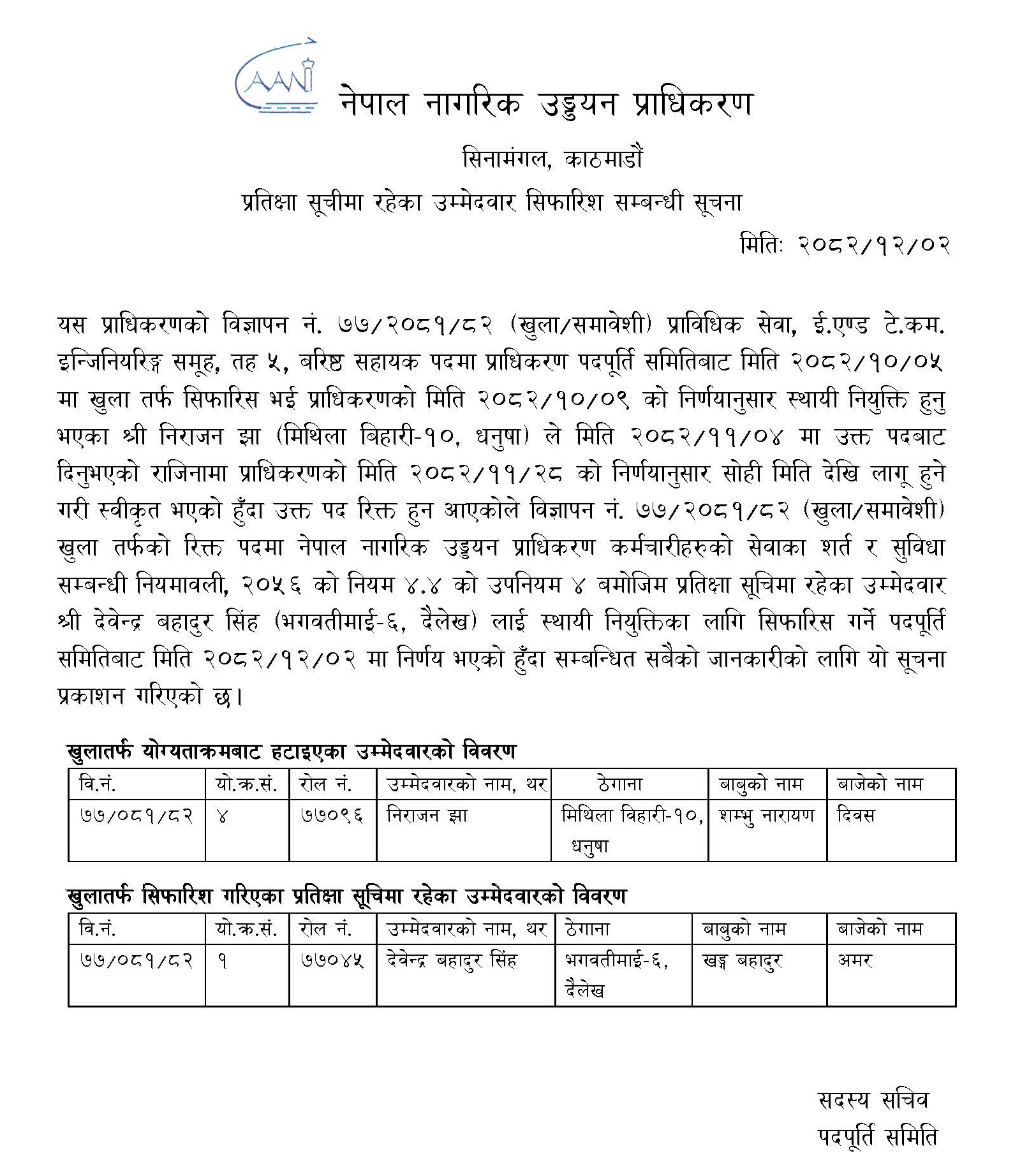 प्रतिक्षा सूचीमा रहेका उम्मेद्वार सिफारिश सम्बन्धी सूचना