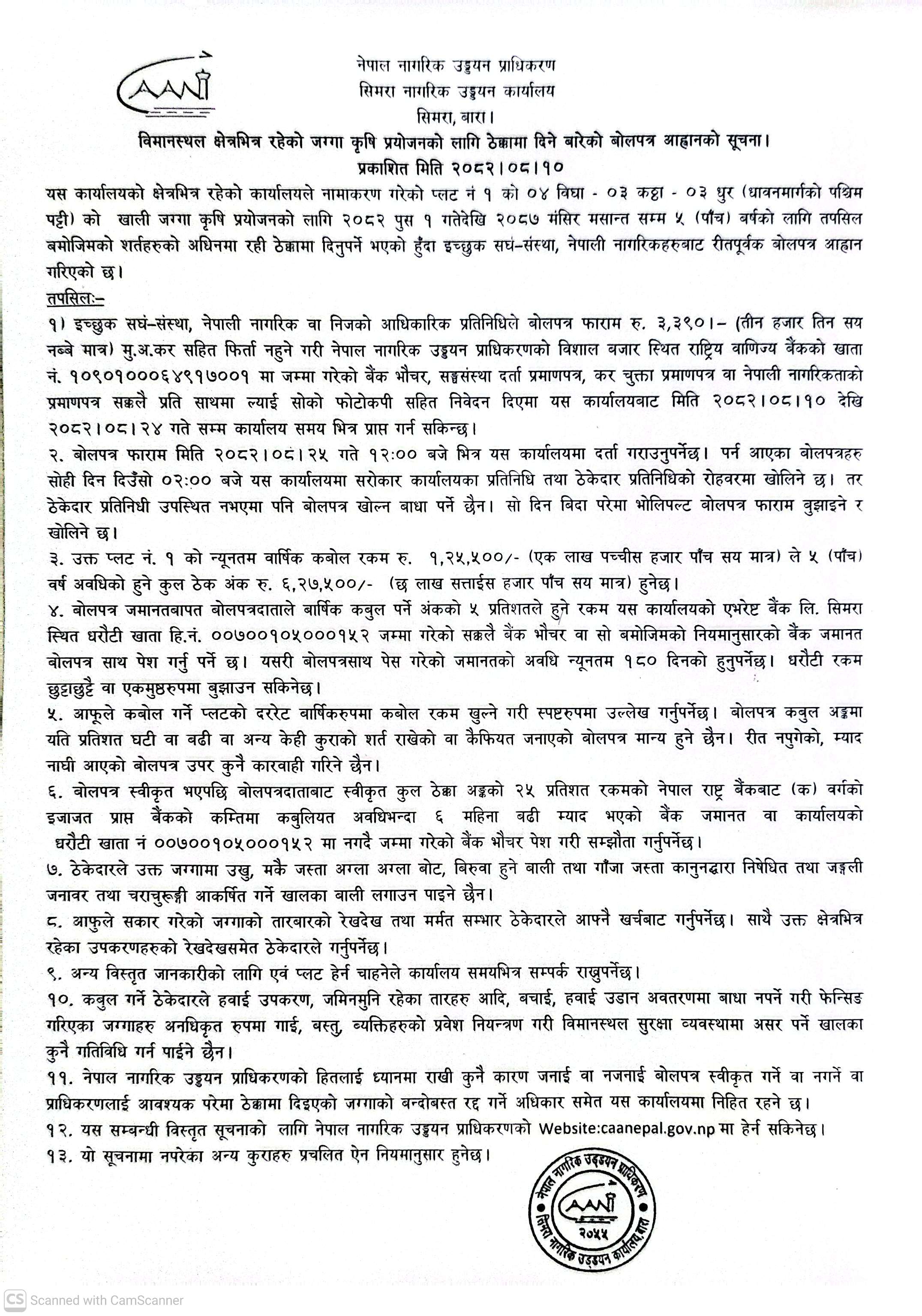 सिमरा विमानस्थल क्षेत्रभित्र रहेको जग्गा कृषि उपयोगको लागि ठेक्का मार्फत बिसौनी बोलपत्र आह्वानको सूचना