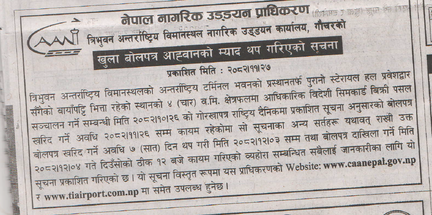 खुला बोलपत्र आह्वानको म्याद थप गरिएको सूचना (त्रि.अ.वि.ना.उ.का.)