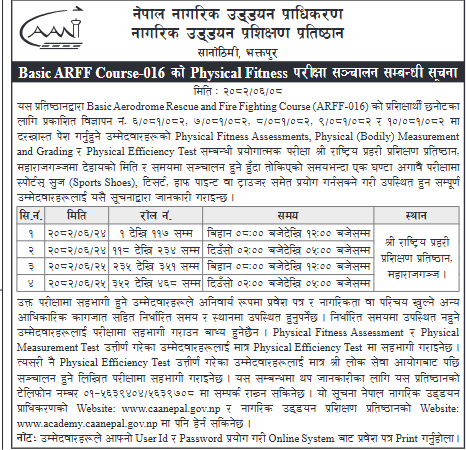 Basic ARFF Course-016 को Physical Fitness परीक्षा संचालन सम्बन्धी सूचना